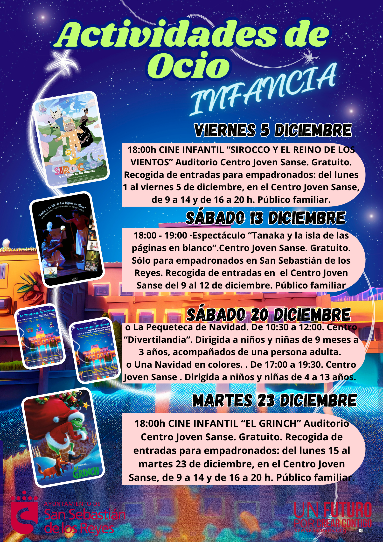 Sábado 13 de diciembre: espectáculo "Tanaka y la isla de las páginas en blanco" de la Compañía “Escenario Pedagógico”. En el Auditorio del Centro Joven Sanse “Daniel Rodríguez”, a las 18:00. Recogida de entradas del martes 9 al viernes 12 de diciembre, en el Centro Joven Sanse “Daniel Rodríguez”, en horario de administración (9:00 a 14:00 y 16:00 a 20:00), solo para empadronados.