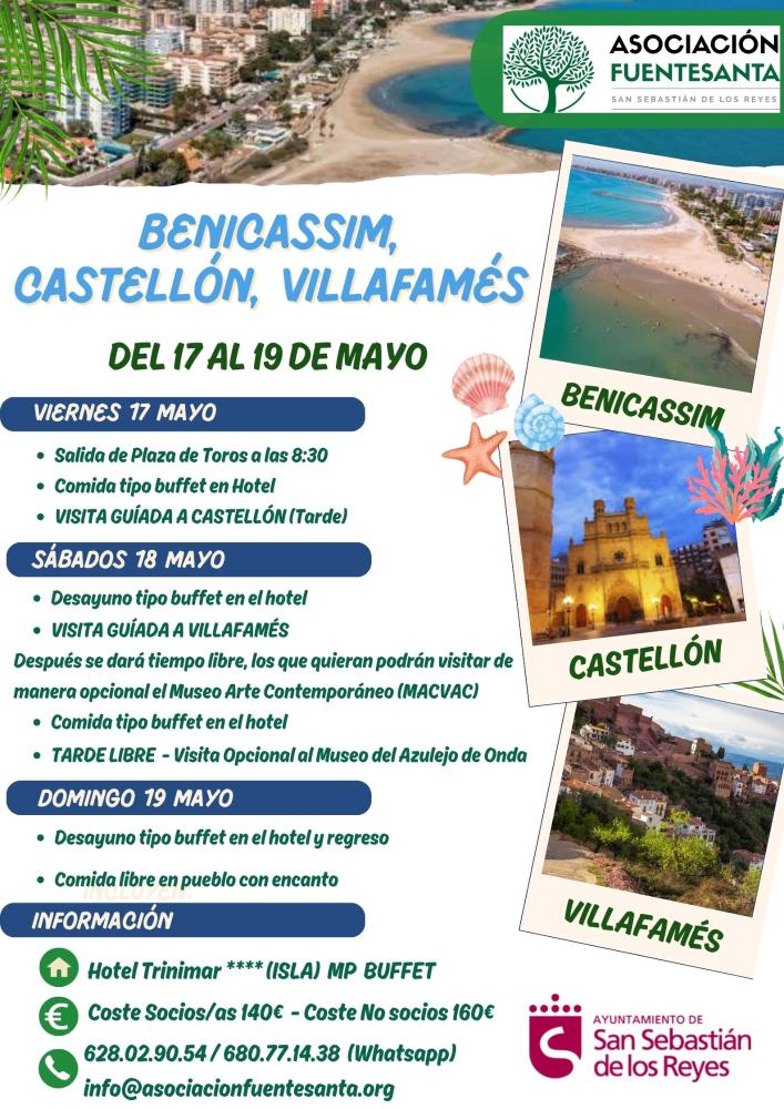 ¡Nos volvemos a ir de viaje 🚌! En esta ocasión partimos hacia el mediterráneo para hospedarnos en Benicassim en el fantástico Hotel Trinimar de 4⭐️, con Media Pensión y Buffet. Realizaremos una visita guiada a la ciudad de Castellón y al día siguiente realizaremos otra a Villafamés, considerado unos de los pueblos más bonitos de España. Habrá actividades opcionales (incluidas), cómo la visita al famoso Museo de Arte Contemporaneo y al Museo del Azulejo de la localidad de Onda, para aquellos que aun les quede fuerzas y ganas de conocer más.