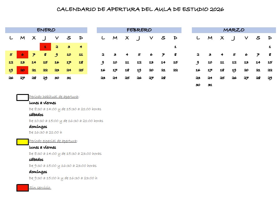 Calendario apertura aula de estudio enero-marzo 2026.