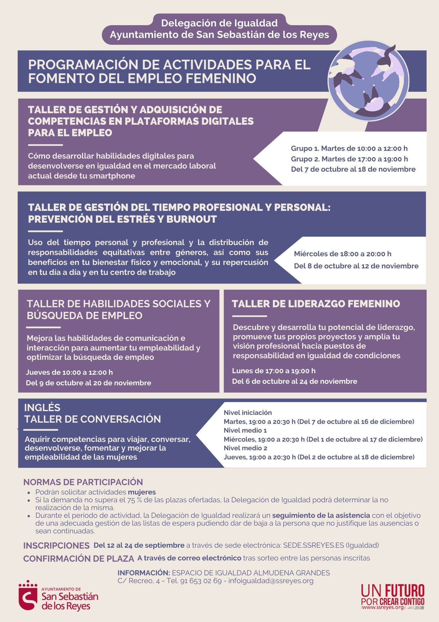 Más información en el espacio de Igualdad ‘Almudena Grandes’, ubicado en C/ Recreo 4, en horario de lunes a viernes, de 08:30 a 14:30 h. Para dudas o consultas, está disponible el correo infoigualdad@ssreyes.org y el teléfono 91 653 02 69.