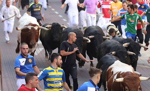 Encierro 28 de agosto de 2018 Encierro 28 de agosto de 2018 Ir a la página Anterior Siguiente La manada, a su paso por la calle Real. Una de las vertigínosas carreras en Estafeta. La carrera a su paso por la calle Real.