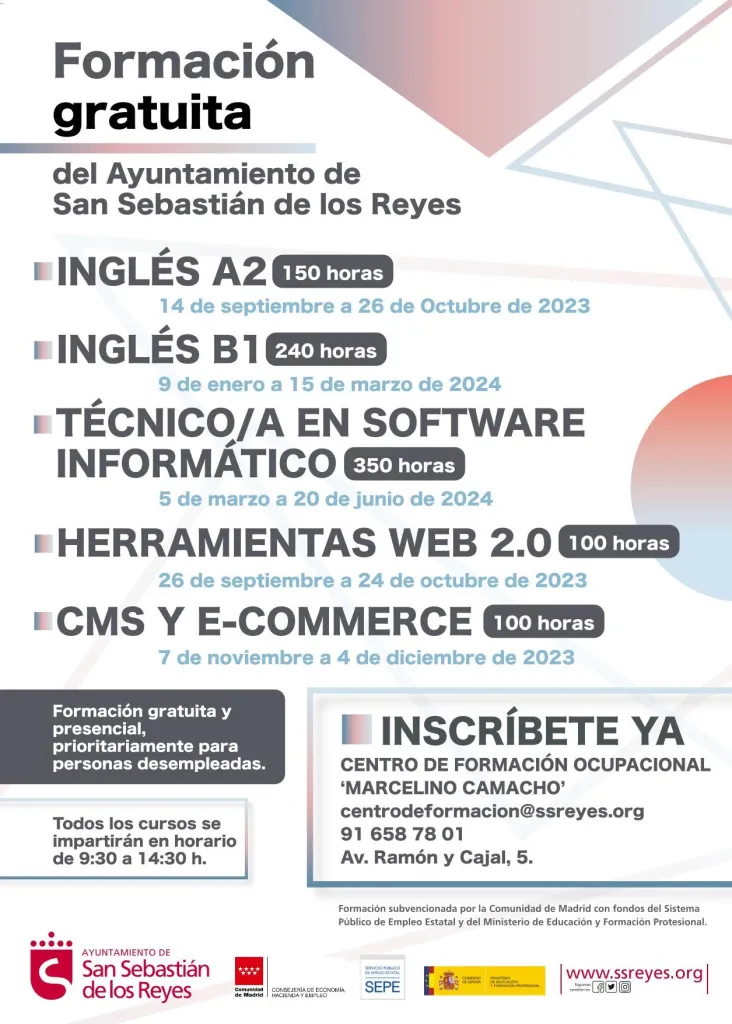 El Ayuntamiento de San Sebastián de los Reyes, a través de la Concejalía de Innovación y Empleo, ofrece gratuitamente a los vecinos de la ciudad una oportunidad única para encontrar empleo y mejorar su formación, a través de diferentes cursos de enorme relevancia, cuya inscripción está ya abierta.