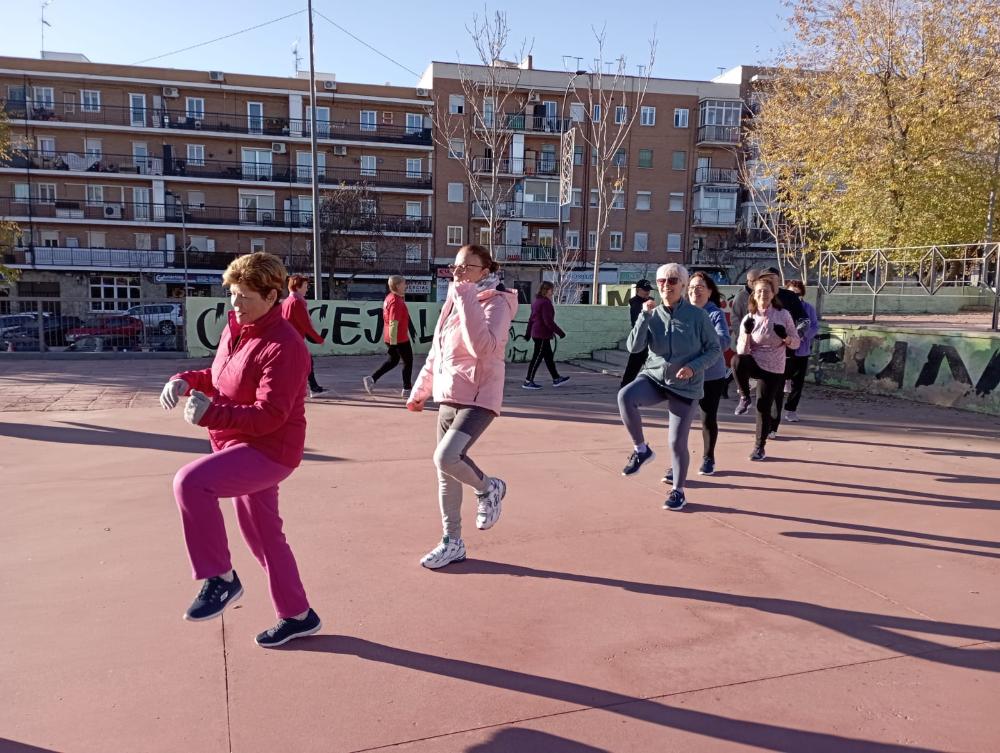 Psicomotricidad al aire libre, práctica de ejercicios en el punto activo para mejorar la condición física de cada usuario favoreciendo las relaciones sociales.