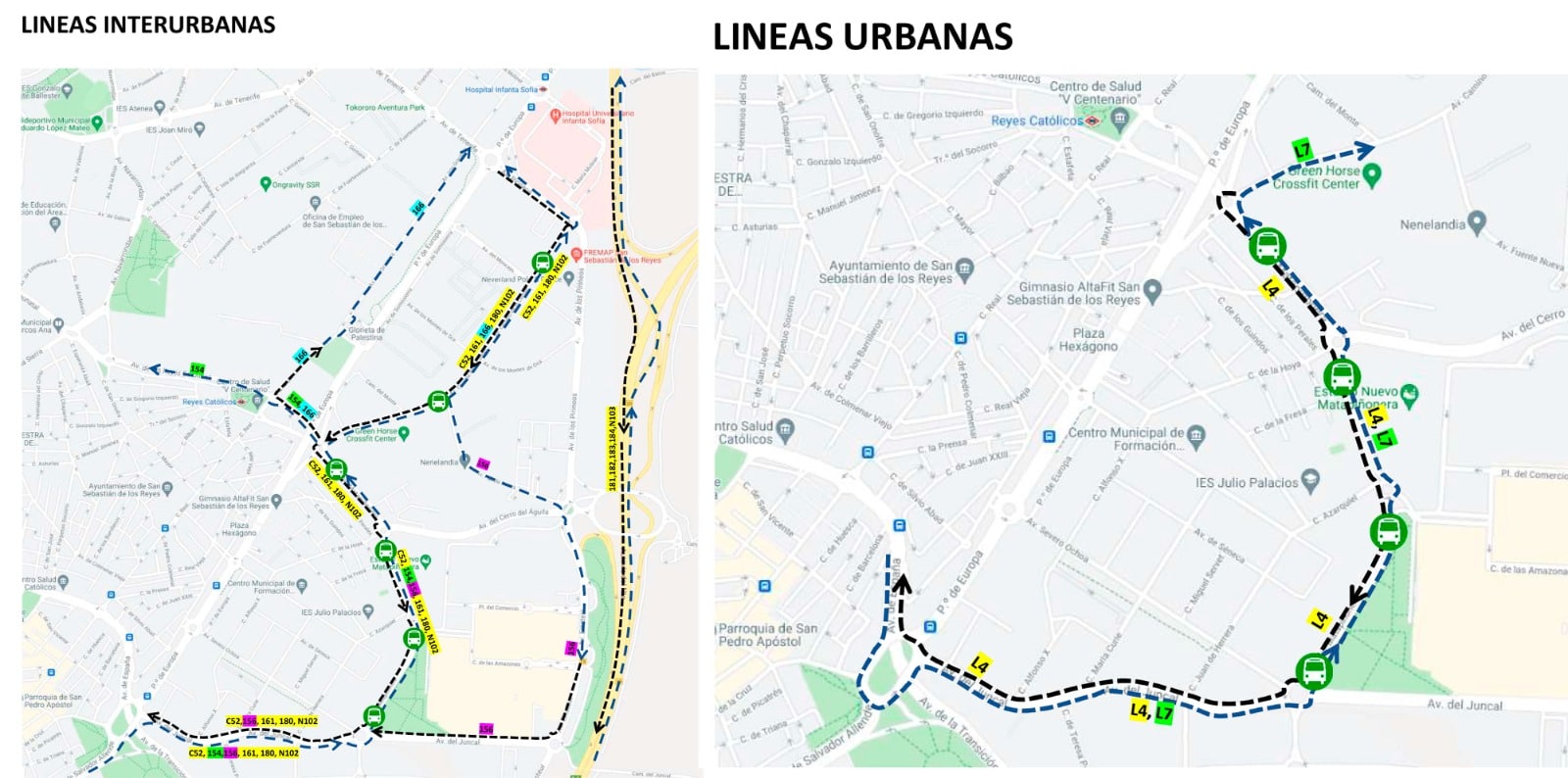 Asimismo, también se han creado dos paradas provisionales (una sentido Madrid y otra sentido Sierra) para las líneas VCM-103 y la 171 –esta última solo estará desviada en sentido hacia Madrid-. Estos autobuses realizarán la parada del Hospital Infanta Sofía y en las mencionadas paradas provisionales, que son: