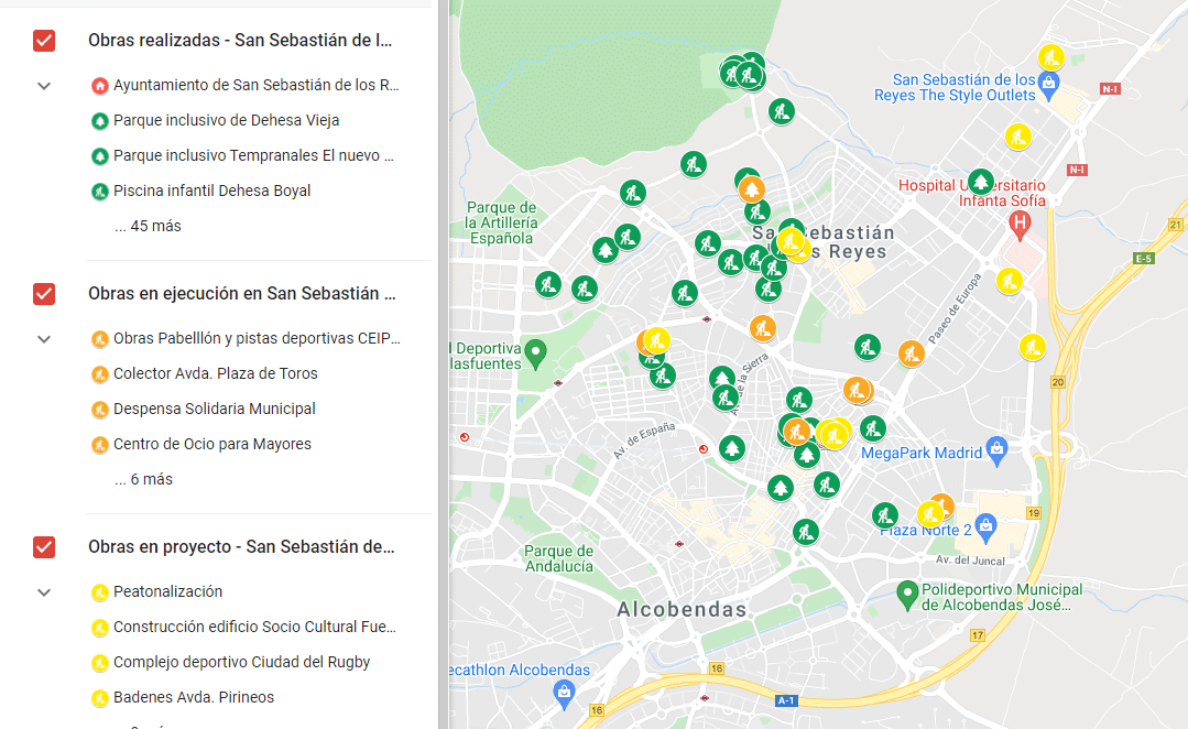 Con este mapa basado en Google Maps los vecinos podrán comprobar de forma instantánea los trabajos que se han realizado en el municipio desde el 2019, los que actualmente están en ejecución y las actuaciones que en este momento están en fase de proyecto.